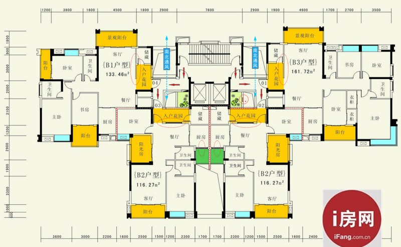 一期开发的是B区,B区是由8栋29+1、31+1的高层构成的商住楼,总户数876户,地下室车位配比大于1:1,中庭花园面积达到了14880㎡。目前户型有96.3-116.27平方米的二房、130平方米的三房、143.05-161.72平方米的四房。